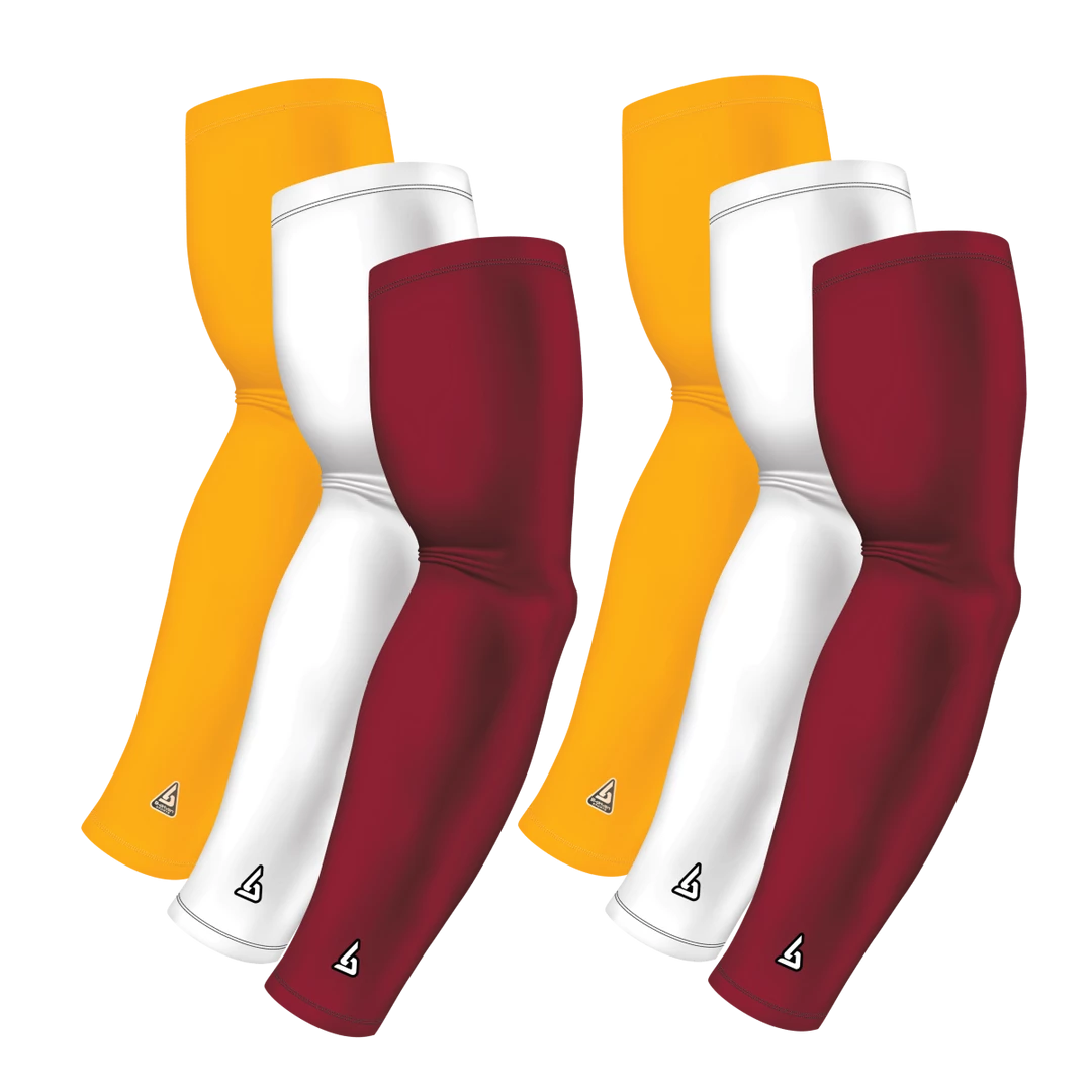 6-pack Bundle | Solids | Maroon Dark/White/Yellow Dark | Pro-Fit Arm Sleeve, developed for active and repetitive use providing a true compression quality. Designed for durable, long-lasting wear. Unlike other sleeves in the market, with B-Driven Sports – 100% Satisfaction Guarantee, we stand by the phrase “you get what you pay for”.̢‰â Sold as One (1) Sleeve